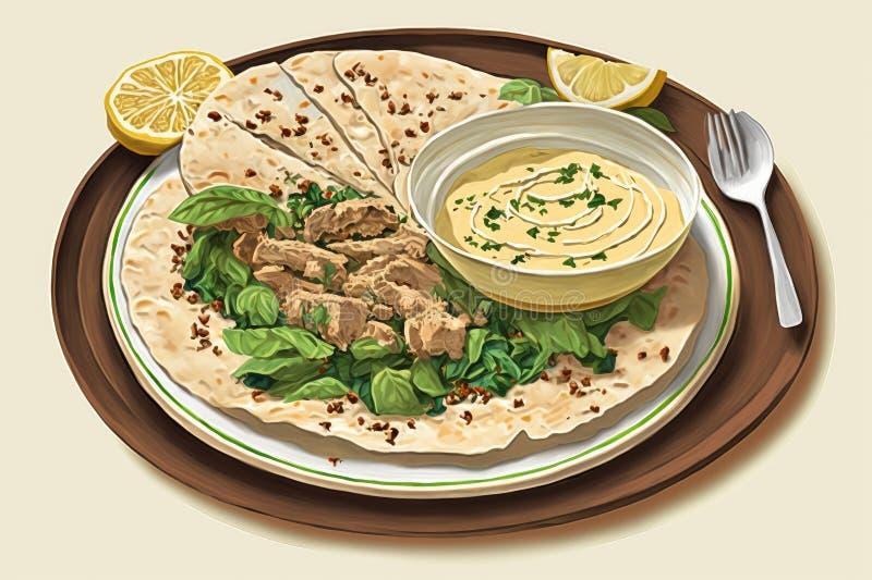 Plate of Shawarma Served with Pita Bread Hummus and Tahini Stock