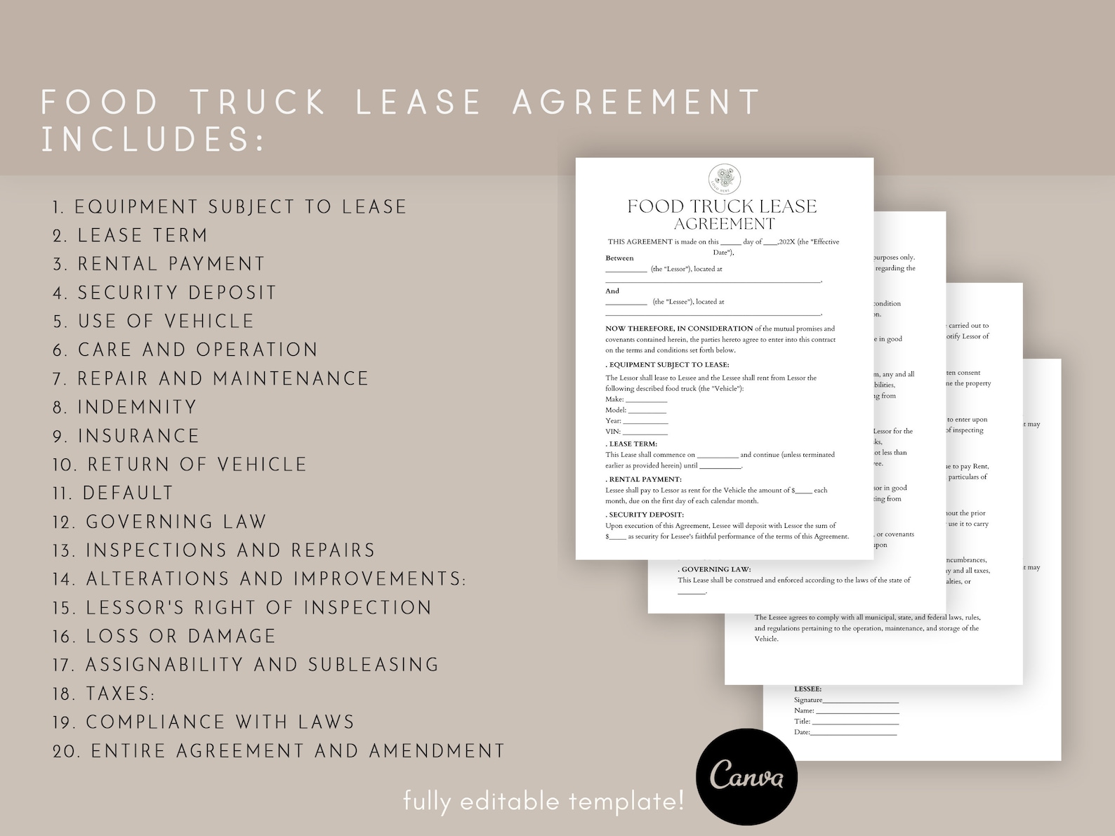 EDITABLE Truck Lease Agreement food Truck Contract commercial Truck