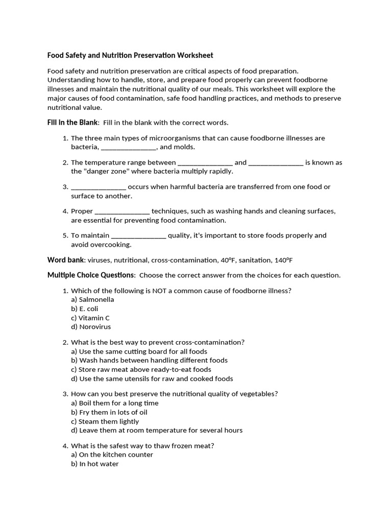 Food Safety and Nutrition Preservation Worksheet PDF Foodborne