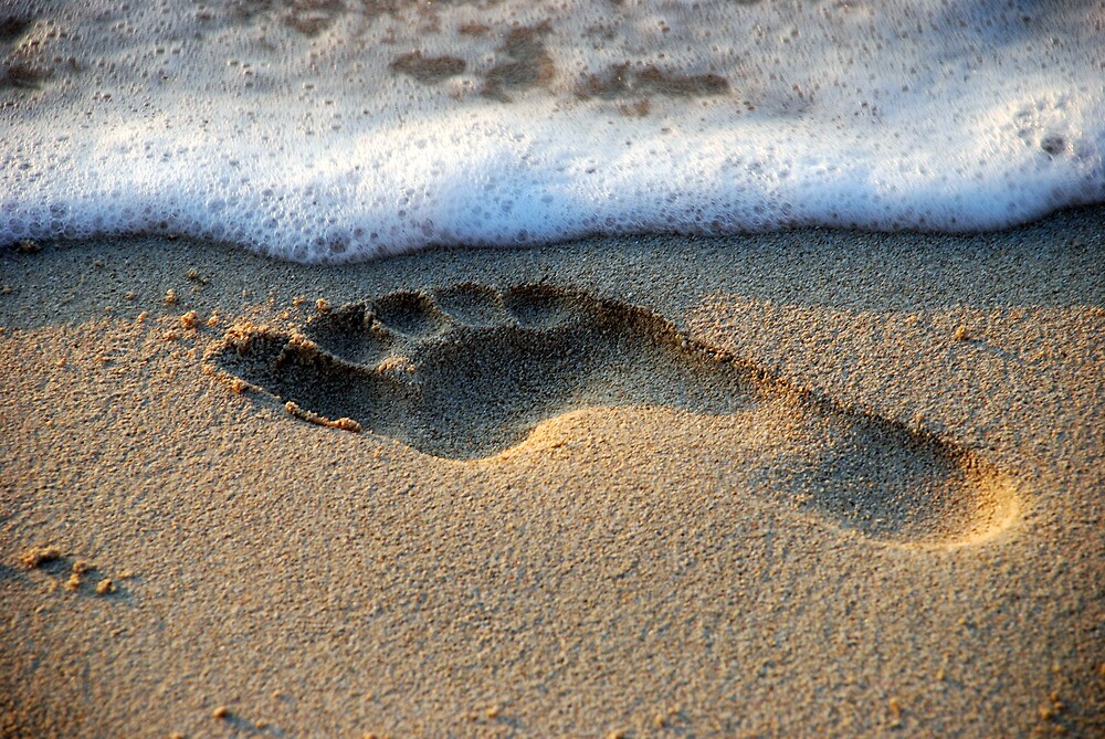 Single human barefoot footprint of left foot in brown yellow sand beach