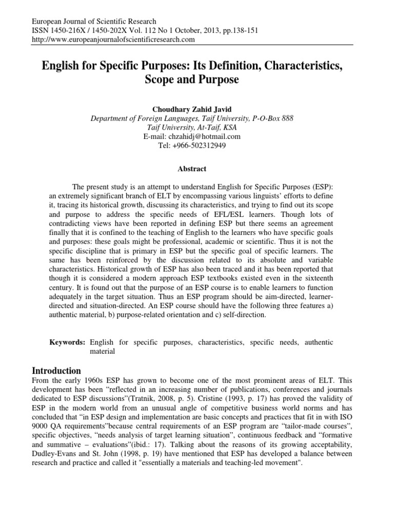 English For Specific Purposes: Its Definition Characteristics Scope