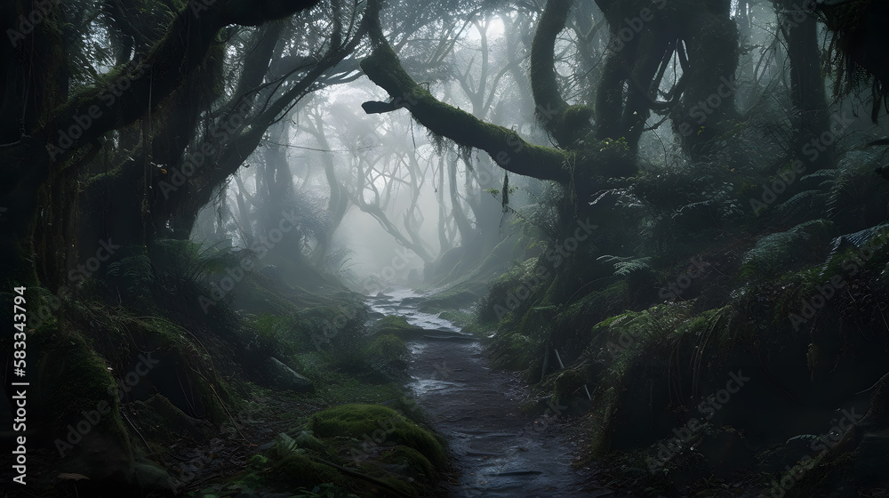 A dense dark and foreboding forest shrouded in mist and shadow The