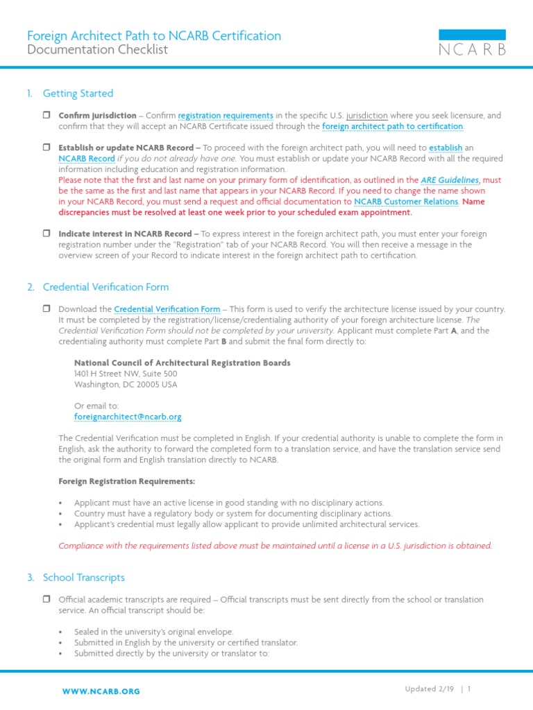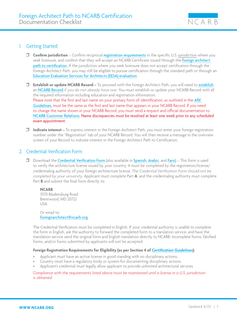 Documentation Checklist: Foreign Architect Path To NCARB Certification