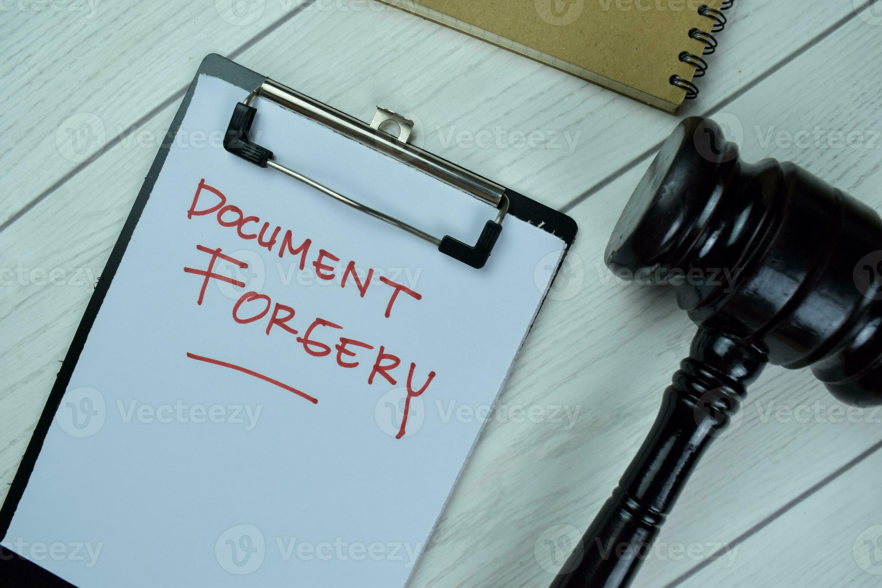 Concept of Document Forgery write on a paperwork with gavel isolated on