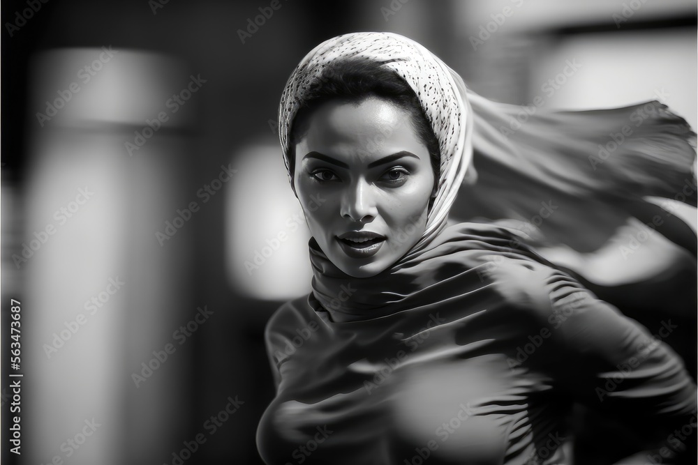 North African young woman wearing a hijab running in the street of a