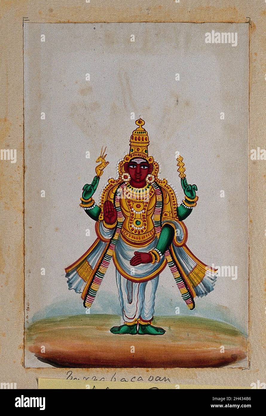 A four armed Hindu deity holding an antelope and a vajra (?) Gouache