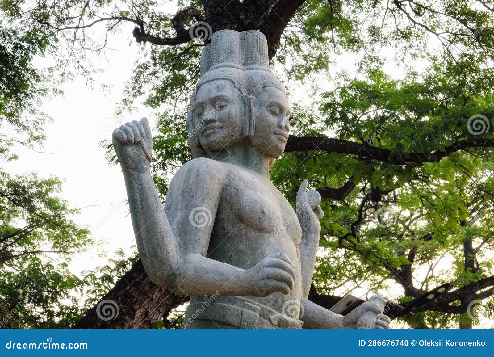 Four armed Multi faced Hindu Deity Sculpted in Cambodia Stock Photo