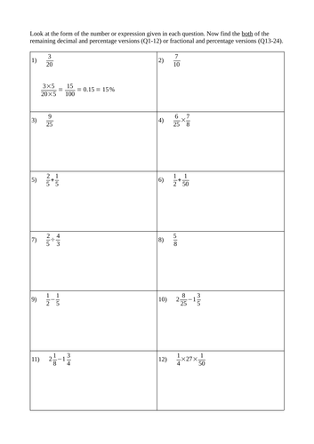Fraction Percentage Decimal Worksheet Tes