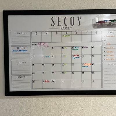 Framed Dry Erase Whiteboard Style Monthly Calendar With Personalized