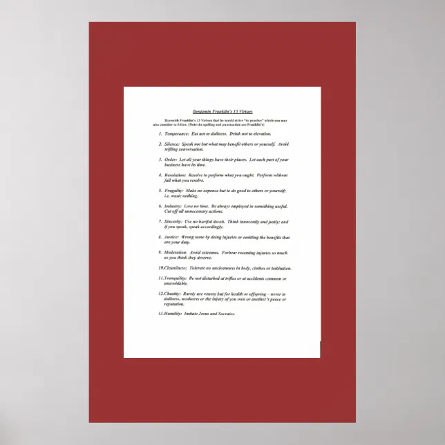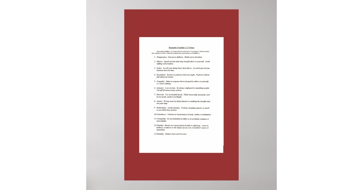 Ben Franklin #39 s 13 Virtues Poster Zazzle