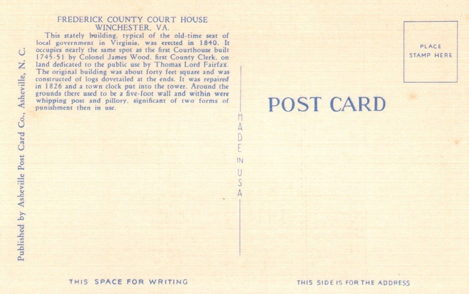 WINCHESTER VIRGINIA 1940s POSTCARD FREDERICK COUNTY COURT HOUSE INFO