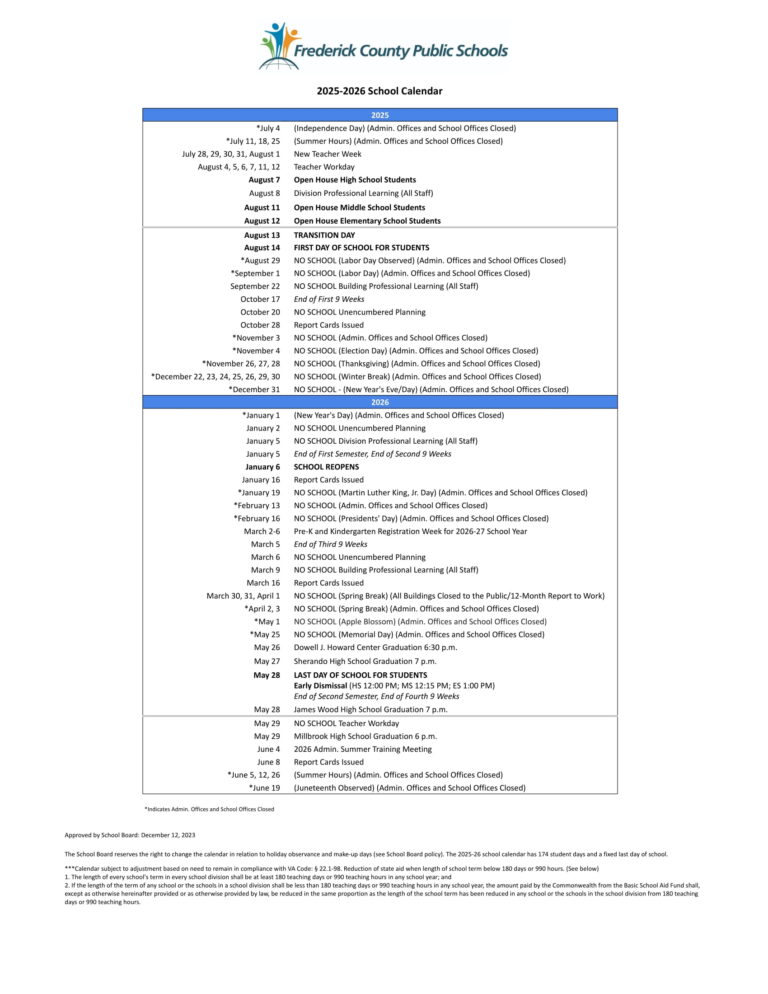 Frederick County Public Schools Calendar 25 26 Revised PDF EduCounty