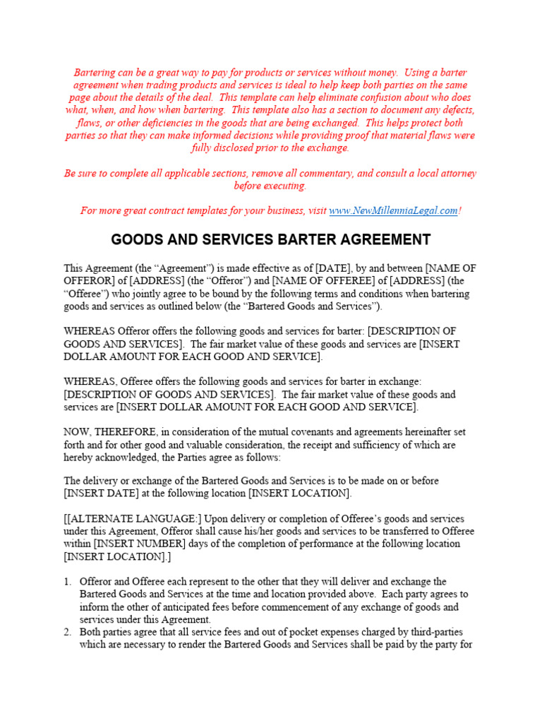 Goods and Services Barter Agreement Template PDF Indemnity Offer