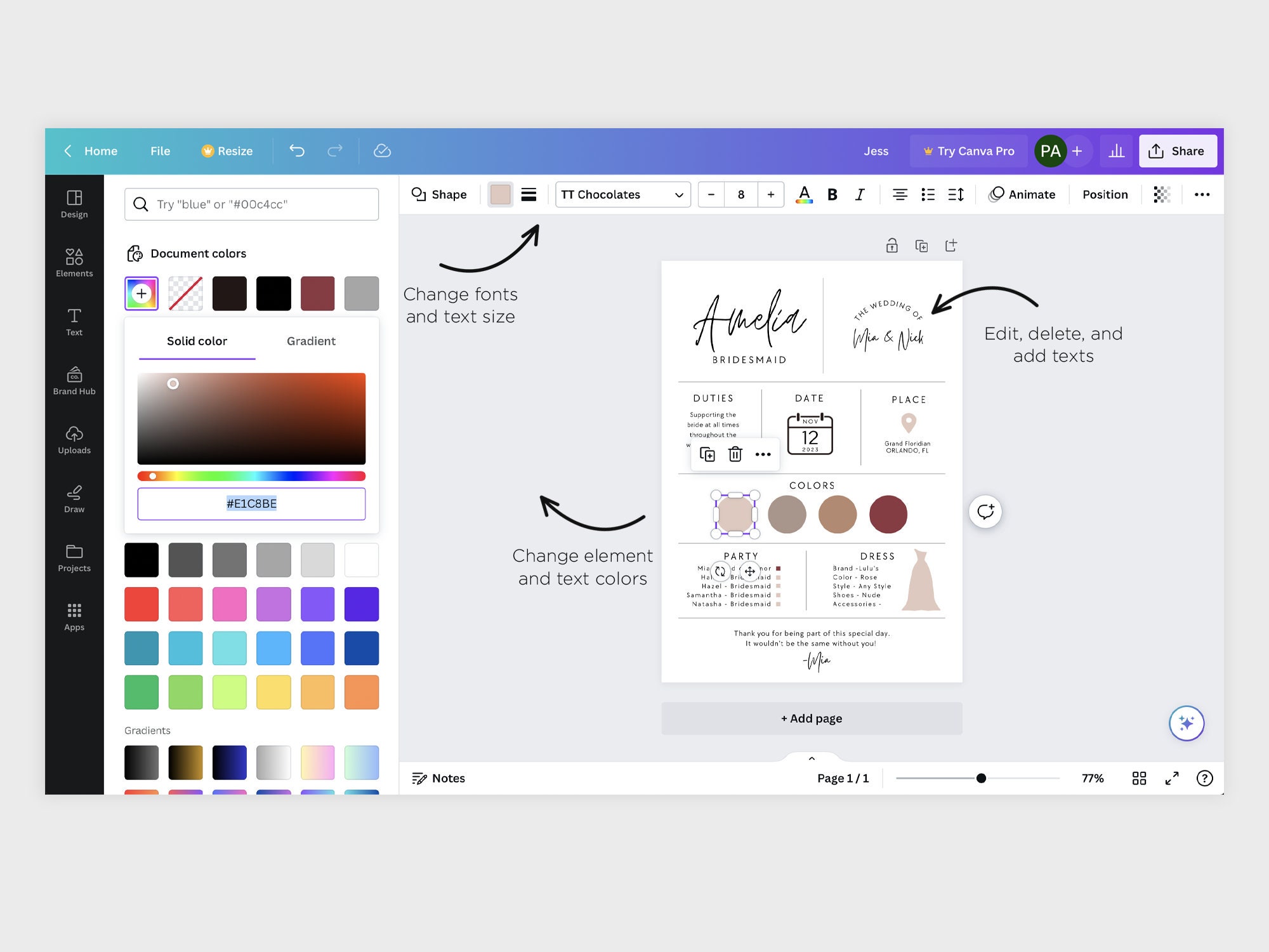 Bridesmaid Info Card Template Canva Template Bridal Party Info Card