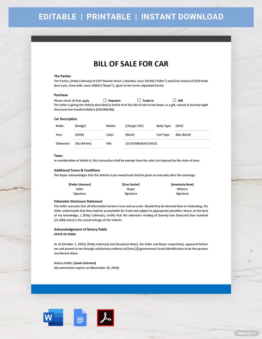 Auto Bill of Sale Template in Word PDF Google Docs Download