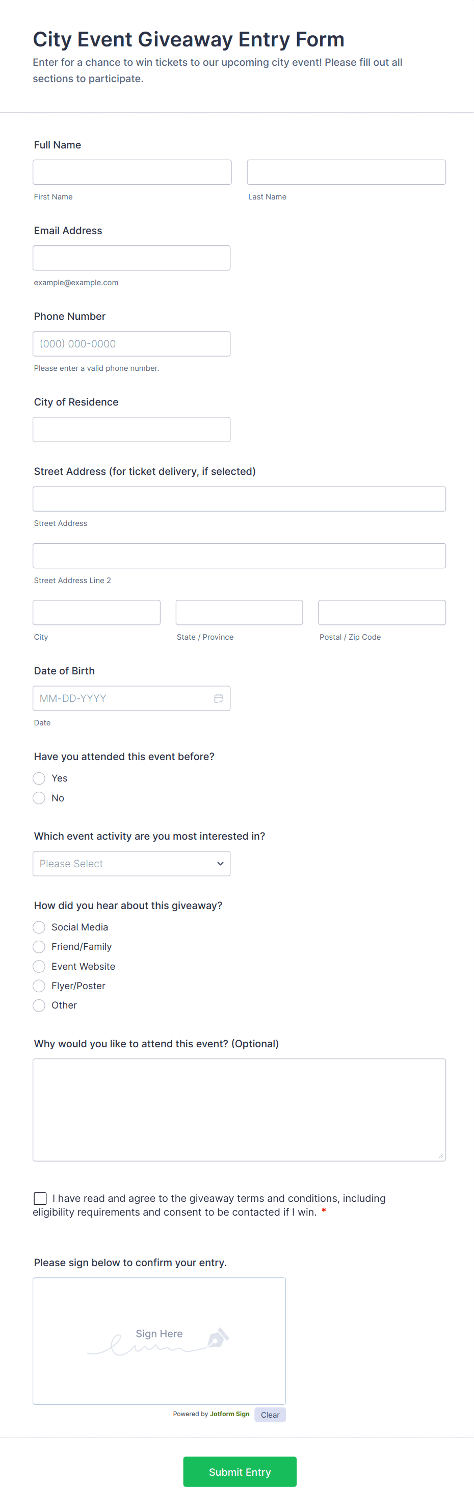 City Event Giveaway Entry Form Template Jotform
