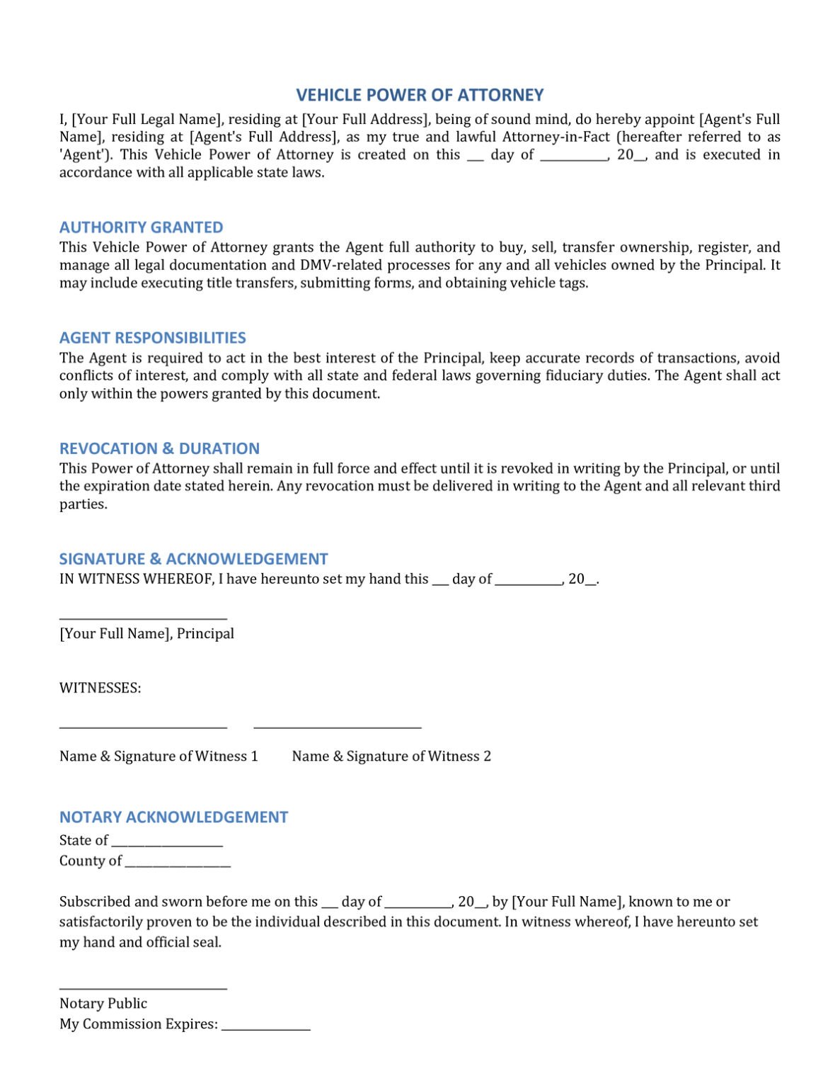Power Of Attorney Template Free Download