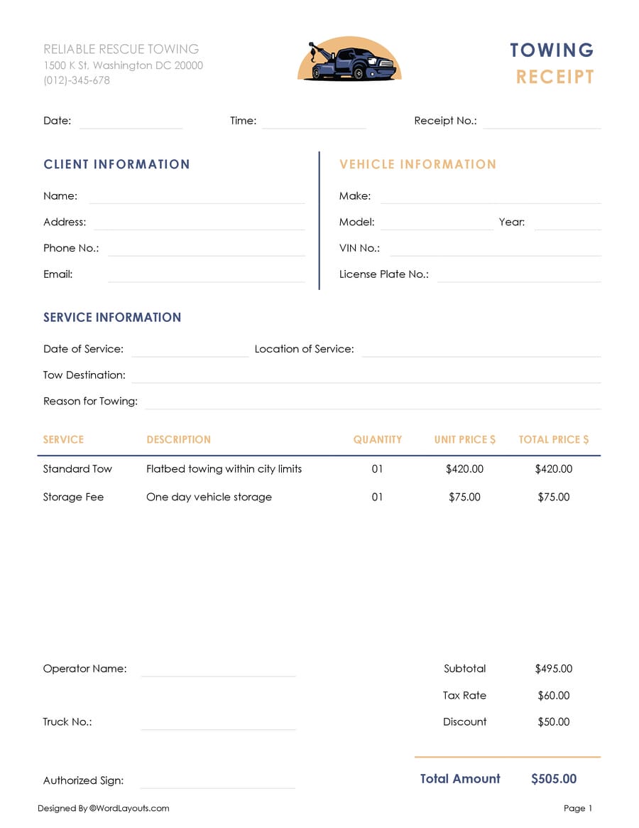 Reliable Rescue Towing Receipt Template WordLayouts