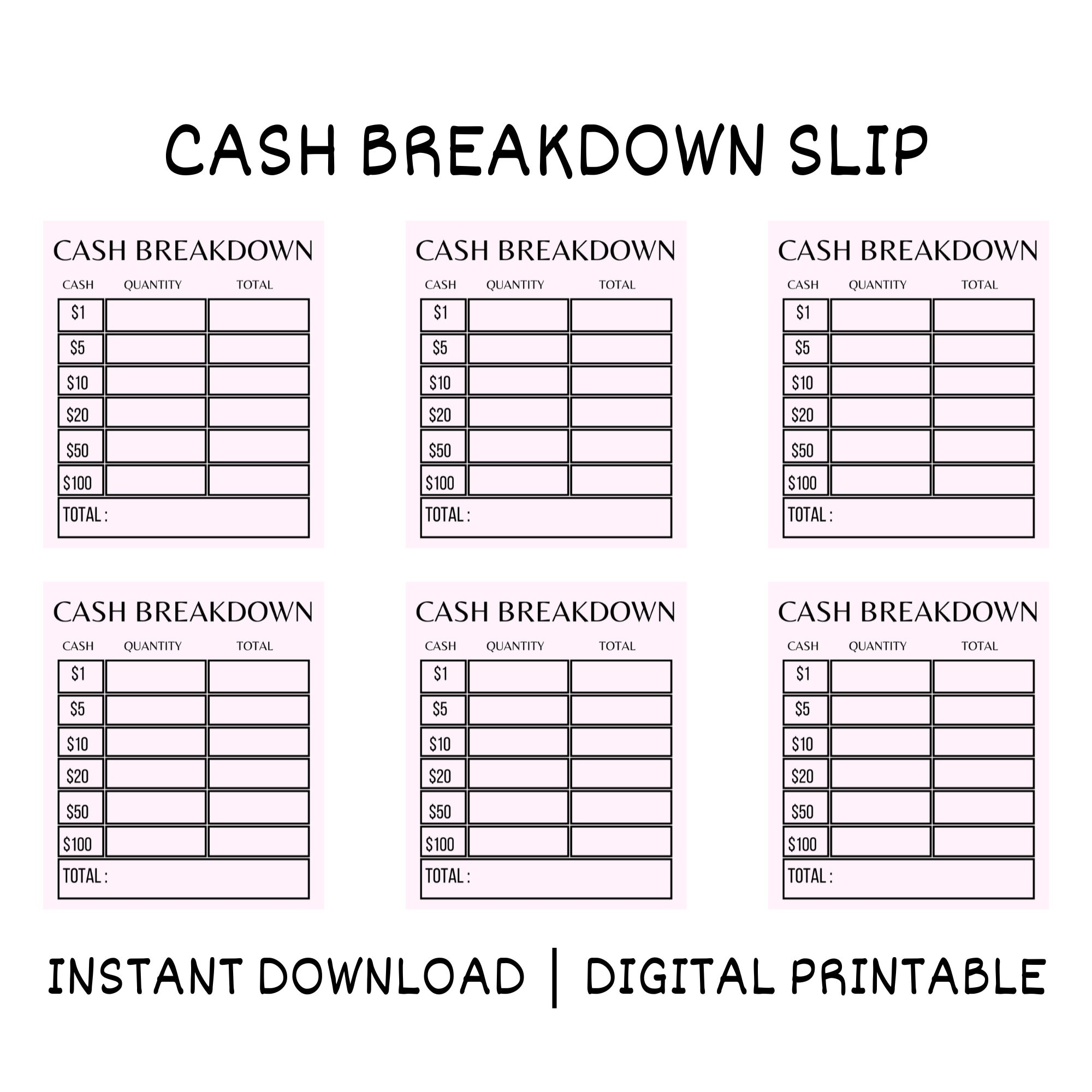 Cash Breakdown Sheet Printable Cash Breakdown Slips Cash Etsy