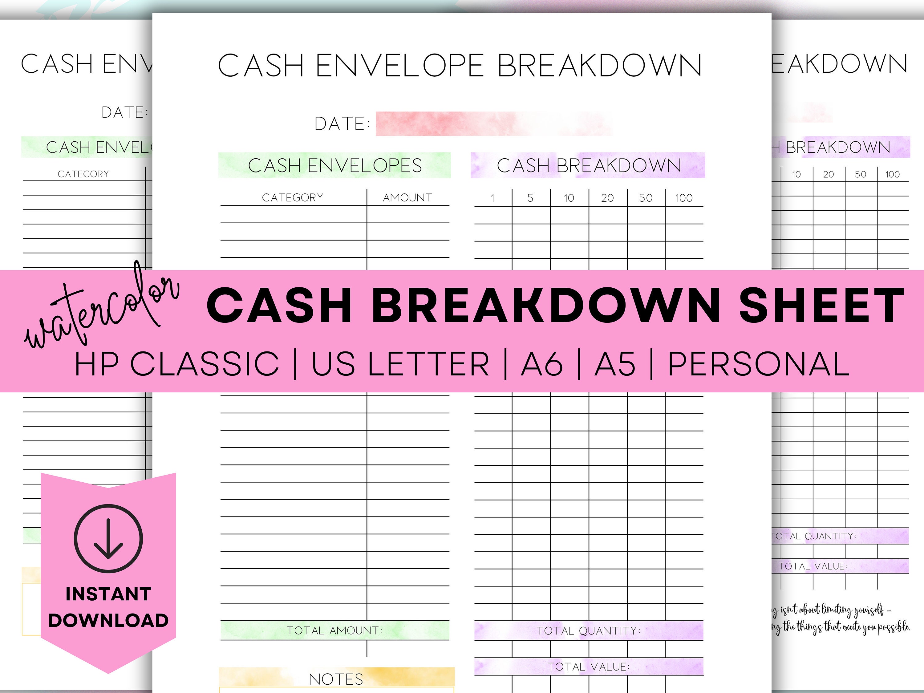 Printable Cash Breakdown Sheets Planner Sheets Planner Inserts Cash