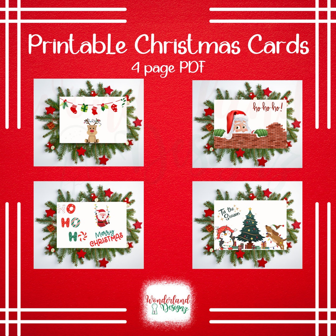 Set of 4 Printable Christmas Cards With Adorable Cartoon Designs