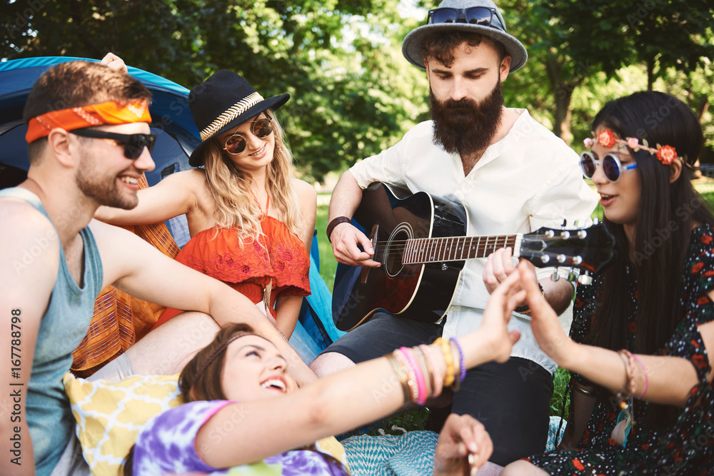 Happy Young Group of Friends Attending Festivals at Summer Stock Image