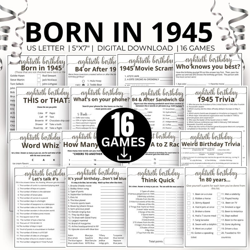 Printable 80th Birthday Party Games Born in 1944 Games 14 Game Bundle