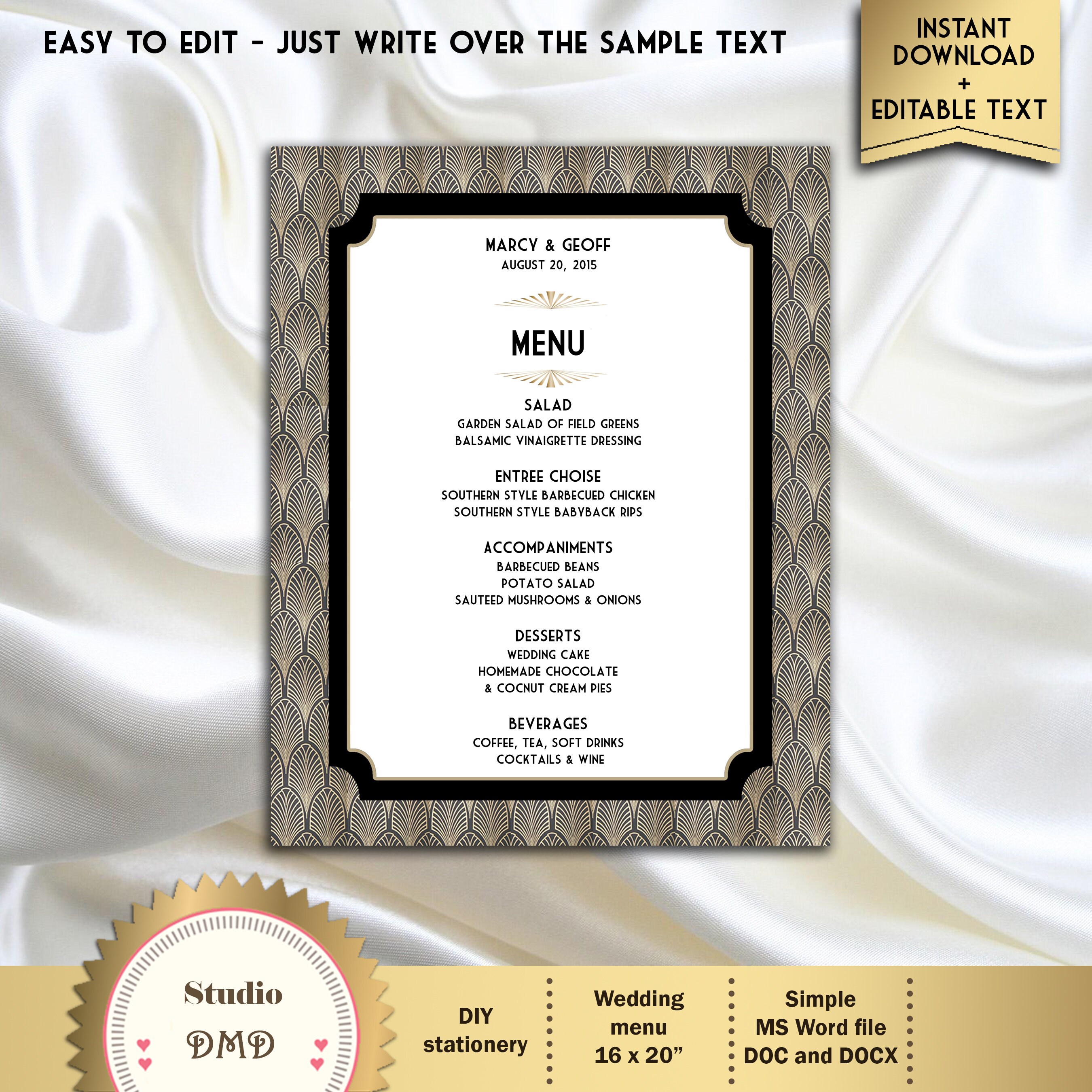 Printable Menu Card Template Great Gatsby Style Art Deco Etsy