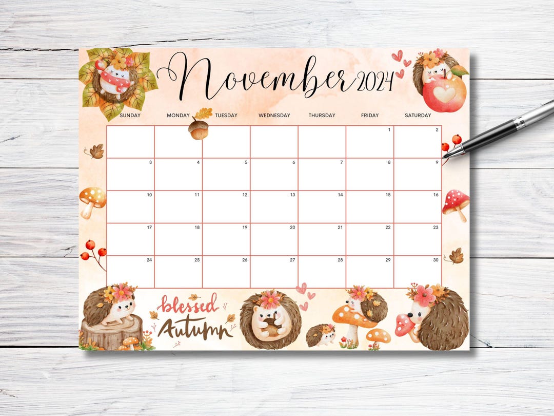 EDITABLE November 2024 Calendar Beautiful Autumn With Cute Hedgehog