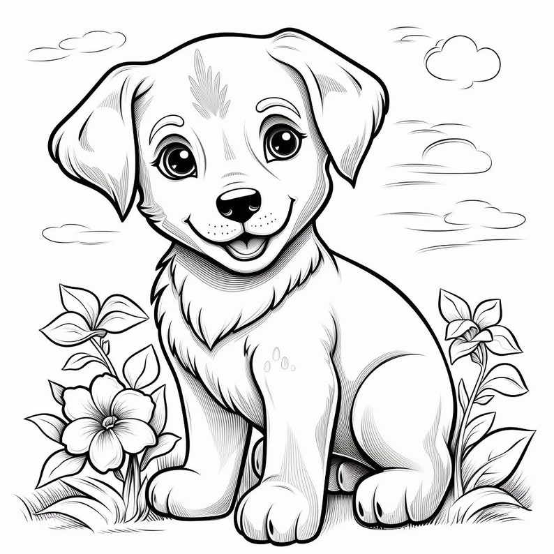 Download Cute Puppy Among Flowers Coloring pages Online Creative Fabrica