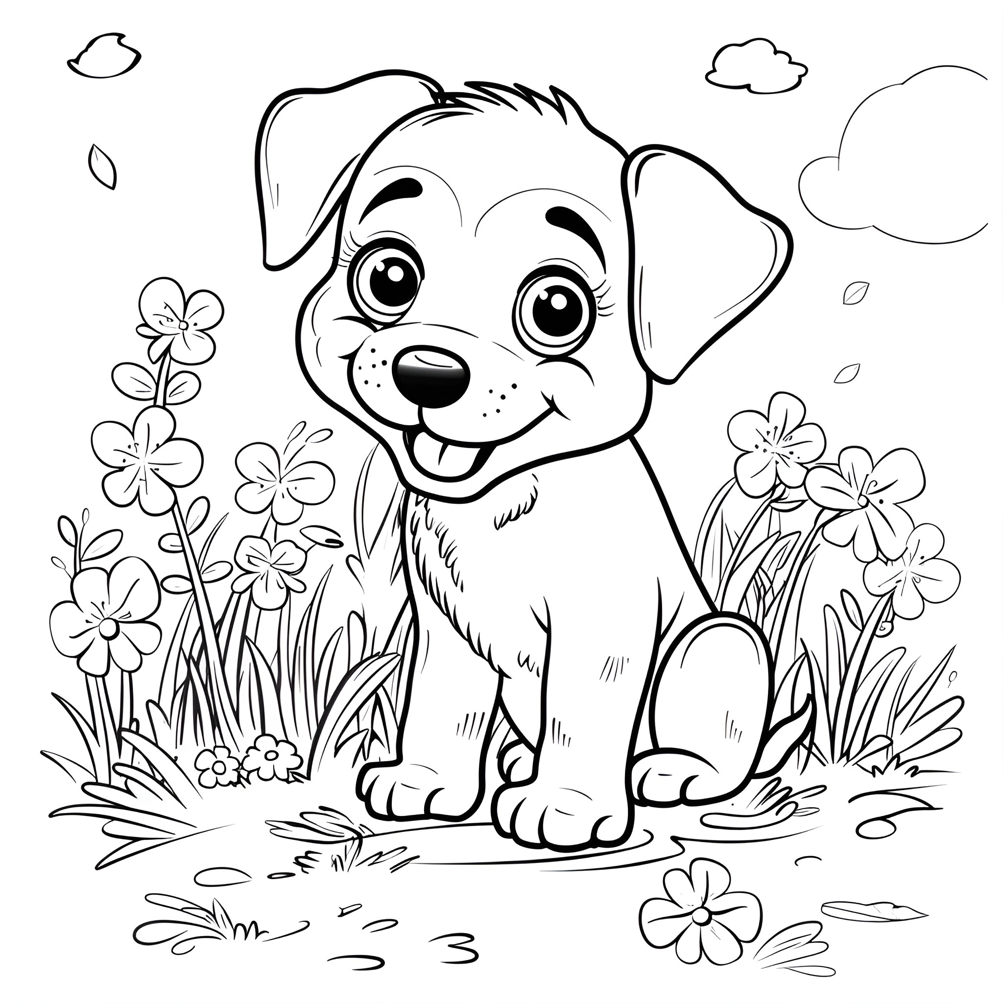 Download Cute Puppy in Grass with Flowers Coloring pages Online