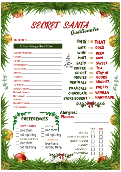 Secret Santa Questionnaire Printable ๐