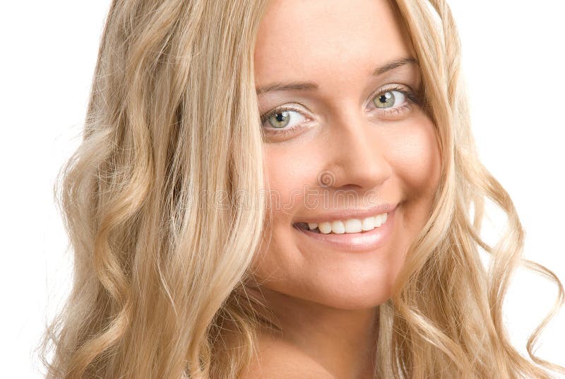 Beautiful Woman Face Blonde Hair Portrait Close Up Studio on White Long