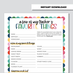 Teacher #39 s Favorite Things Printable Teacher Questionnaire Etsy
