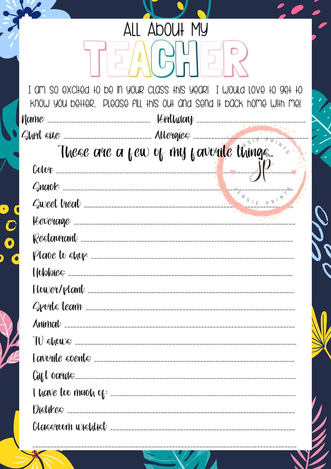 All About My Teacher Teacher Favorite Things Questionnaire Back to