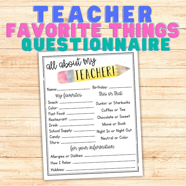 Teacher Favorite Things Questionnaire Printable Instant Download