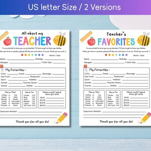 3 Teacher Favorite Things Printable Questionnaires for Teacher Gifts