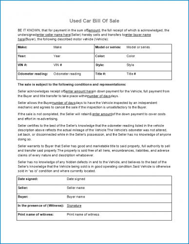 Car Sale Bill Of Sale Template