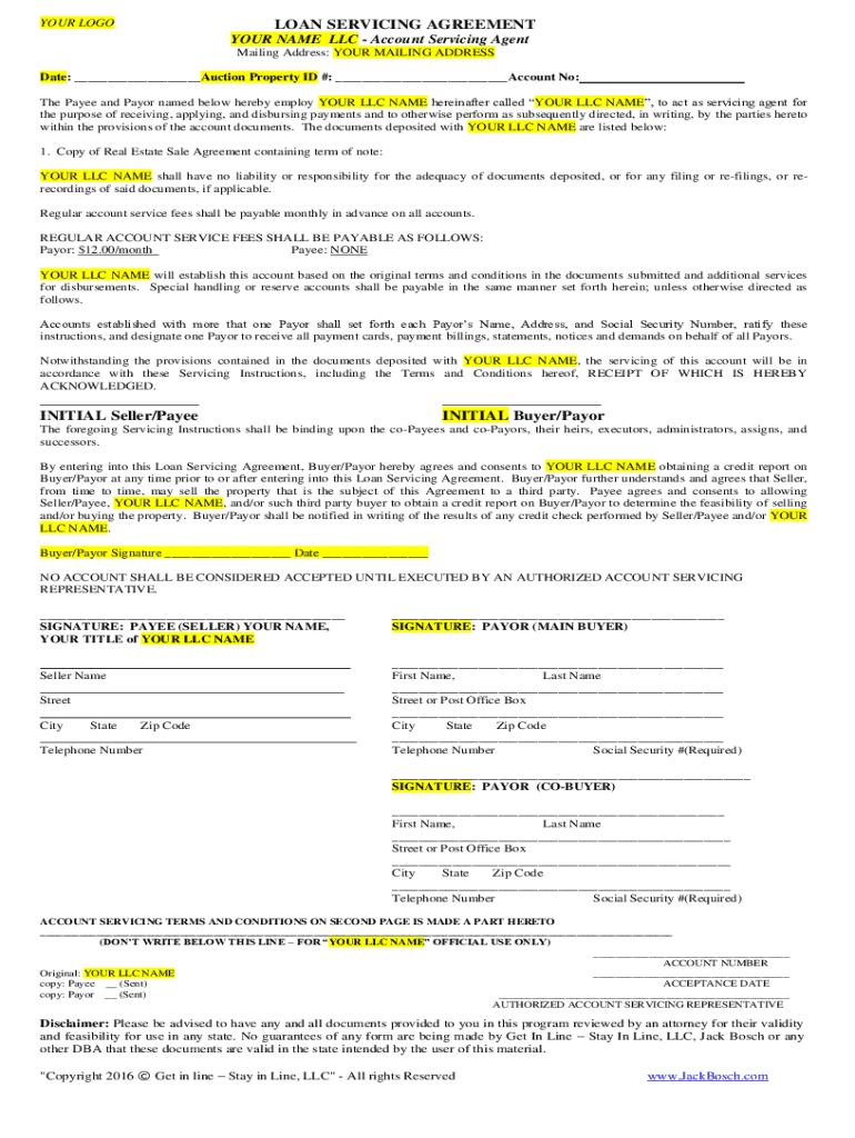Fillable Online Loan Servicing Agreement 2016 Your Name Llc Fax Email