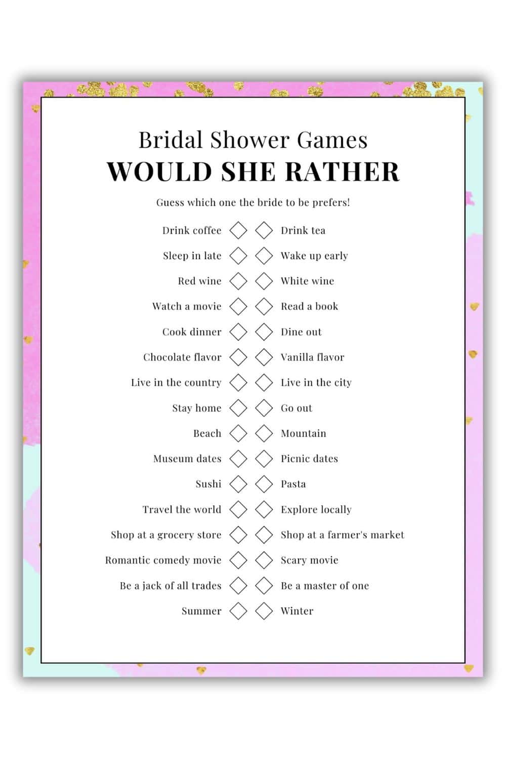 FREE Printable Bridal Shower Games Would She Rather? My Printable Home