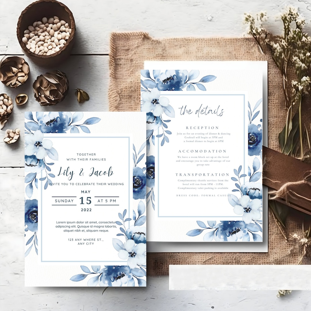 Floral Blue Minimalist Wedding Invitation Editable Wedding Template
