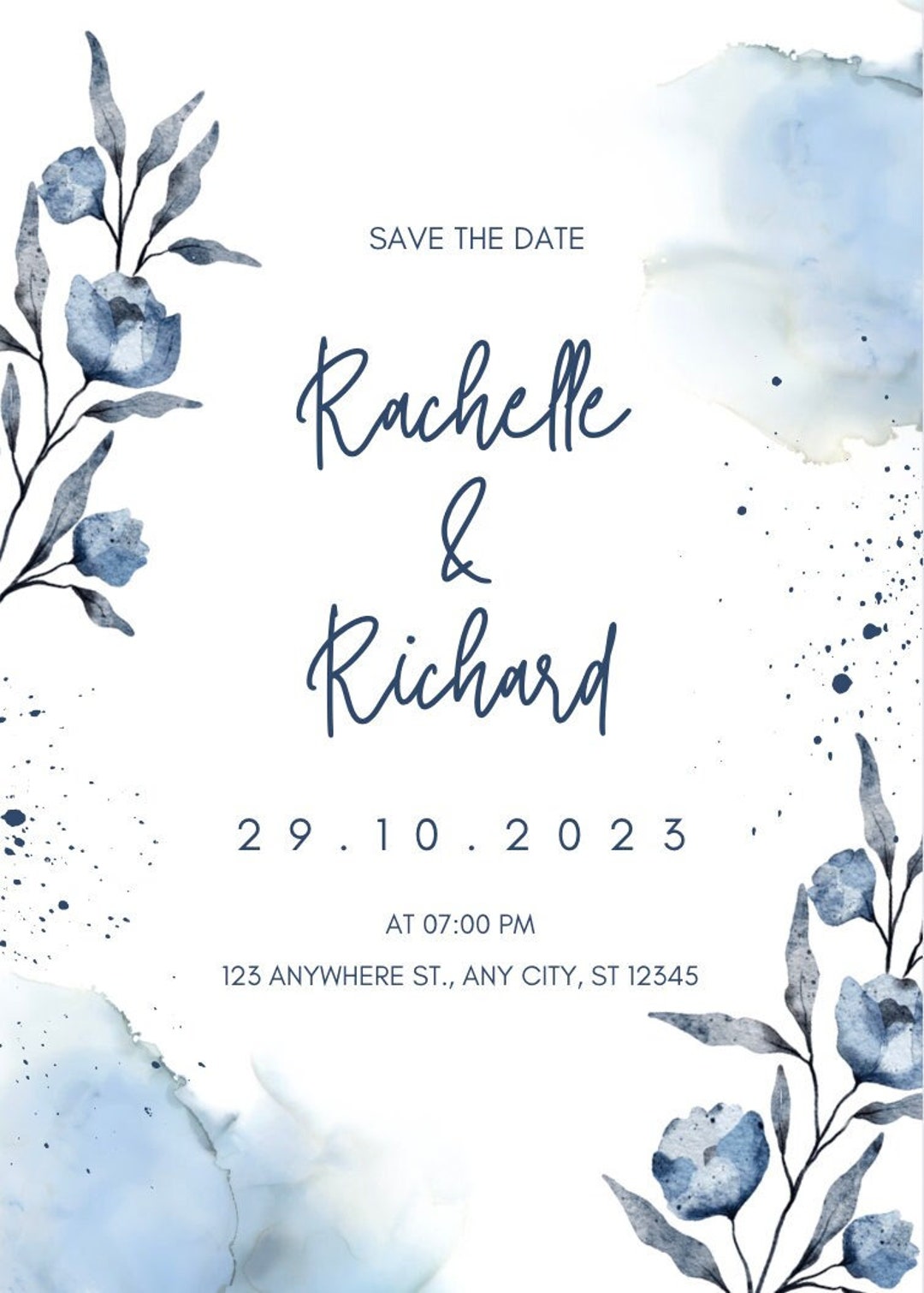 Wedding Invitation and Save the Date Blue Floral Wedding Invitation