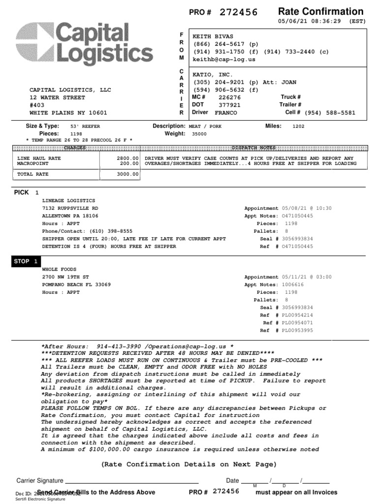Rate Confirmation for Transport of Pork Products from Allentown PA to