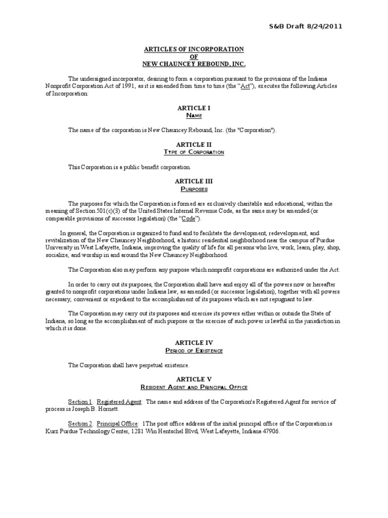 Articles of Incorporation PDF 501(C) Organization Nonprofit