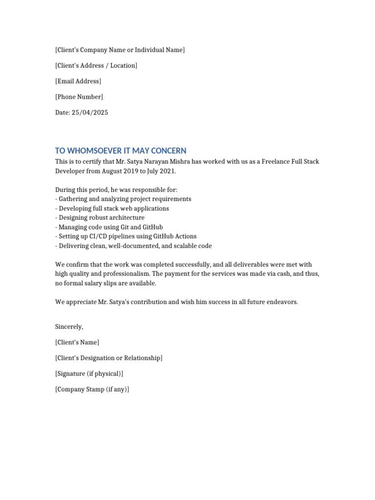 Freelance Work Certificate Template PDF