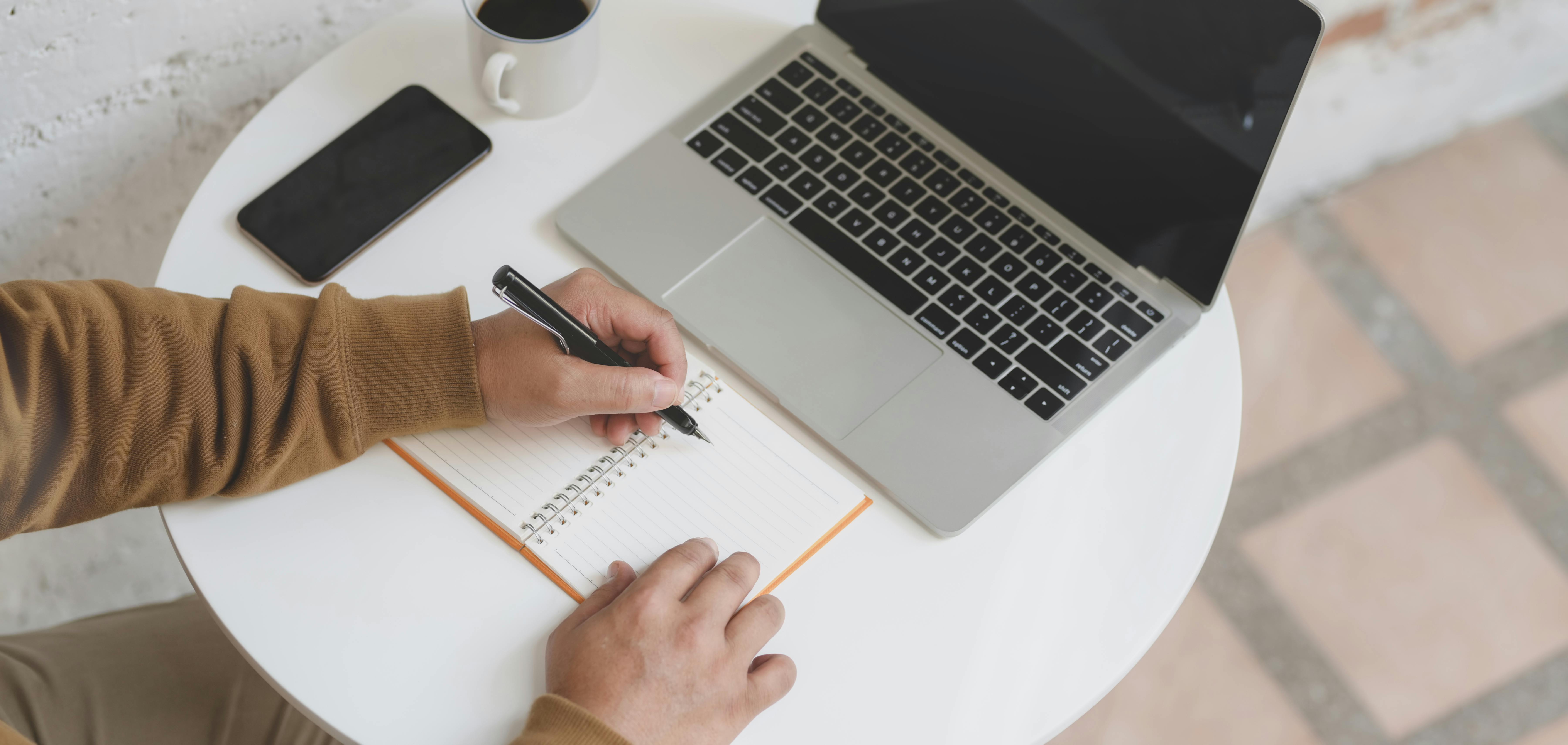 Black Iphone Beside Silver Pen on White Notebook Near Laptop Computer