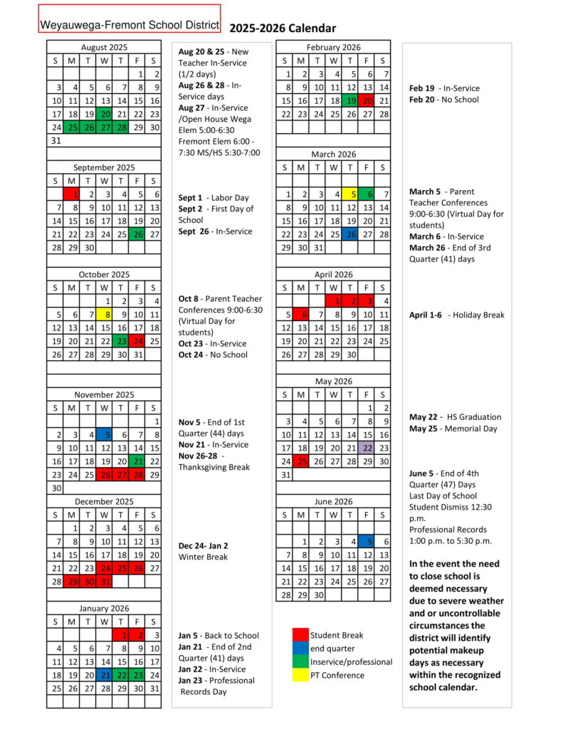 Weyauwega Fremont School District WI Calendar 25 26 Revised pdf