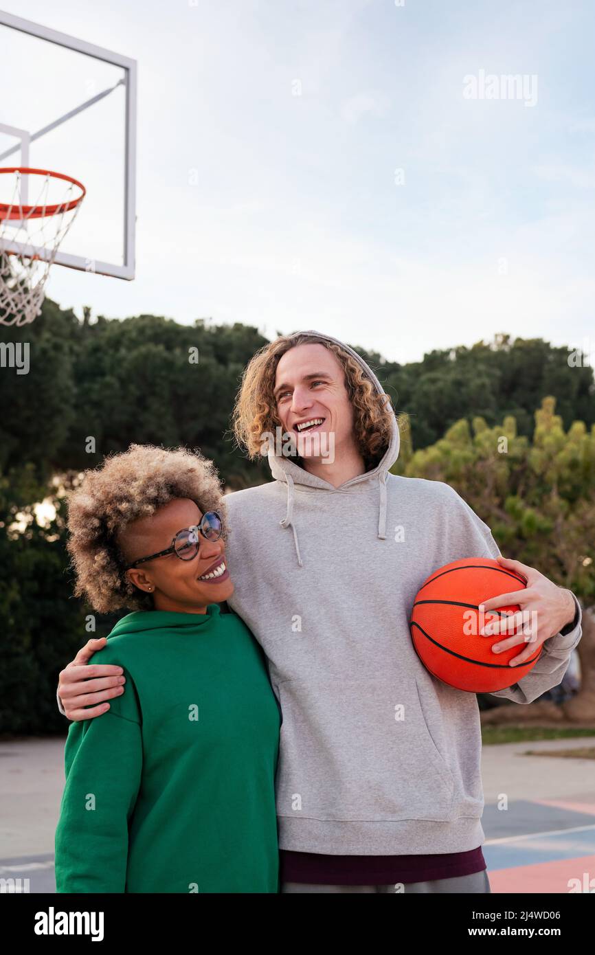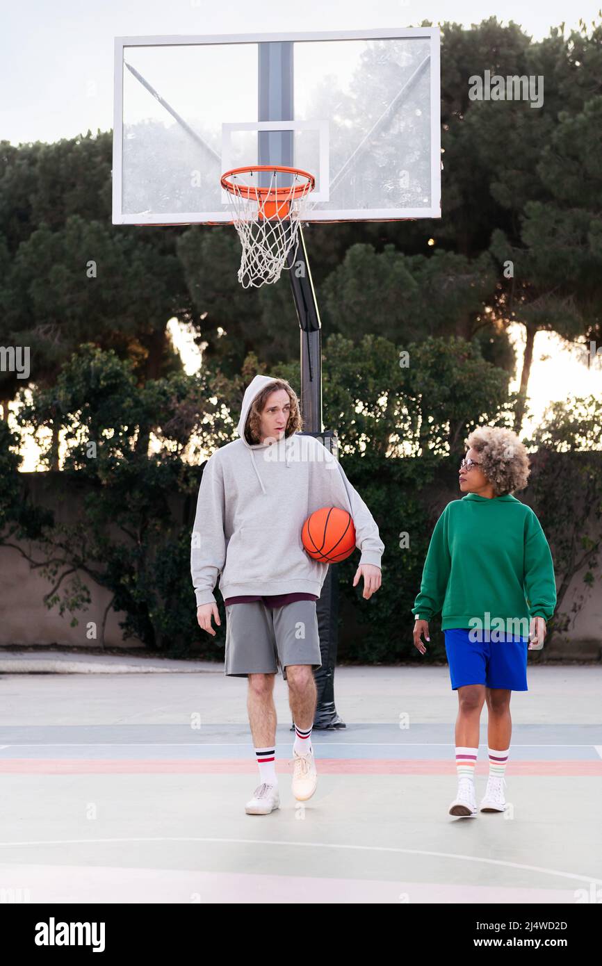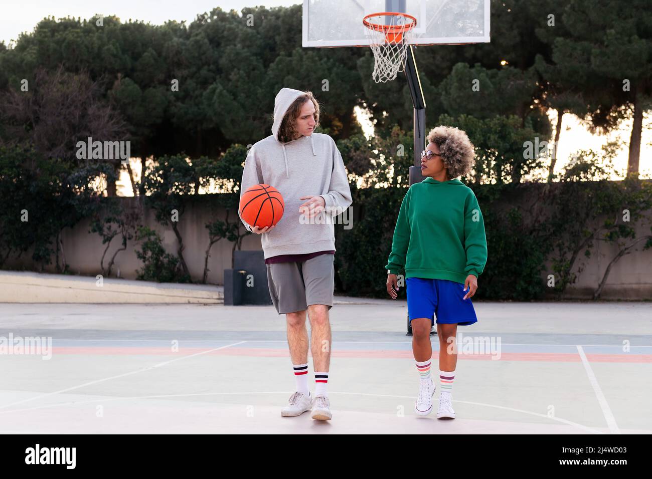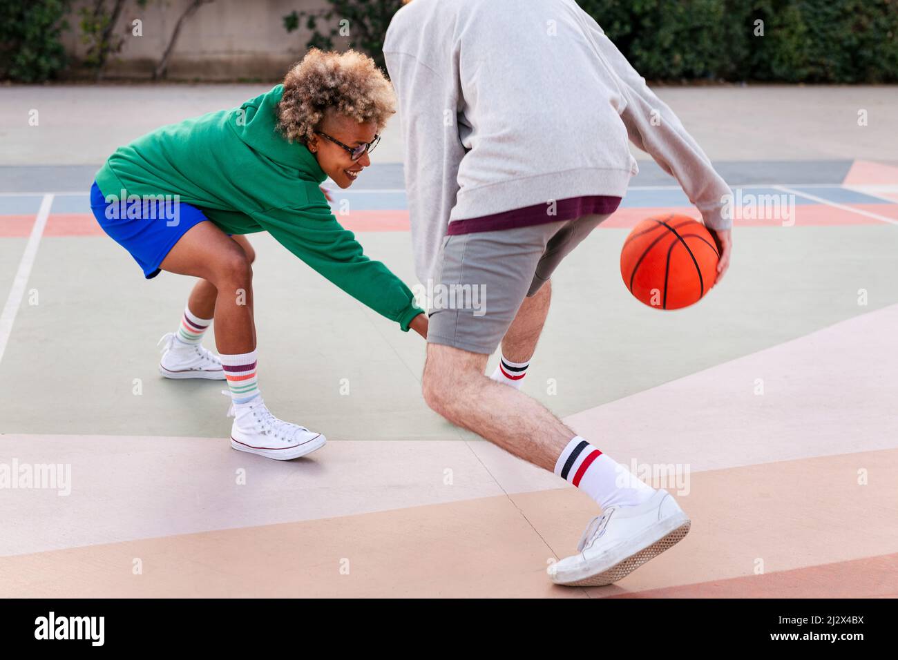 Caucasian and Latin Friends Playing Basketball at Street Court on Sunny