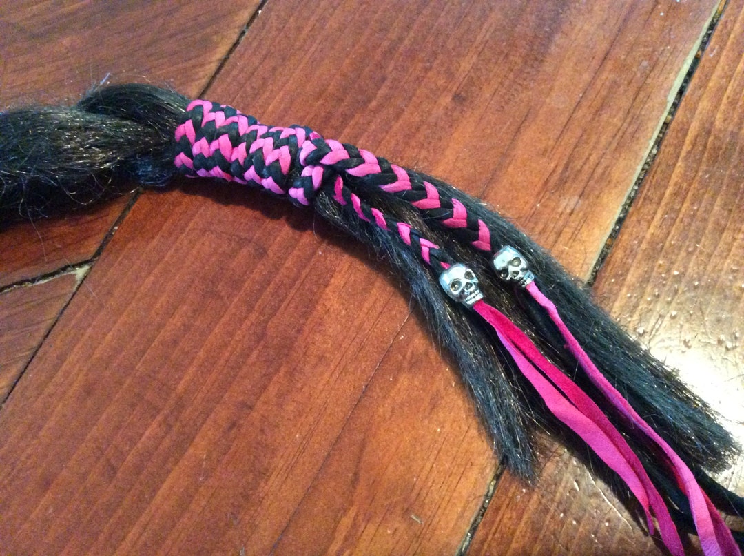 Pink and Black Leather Hair Wrap With Fringe and SKULL Beads Deer Hide