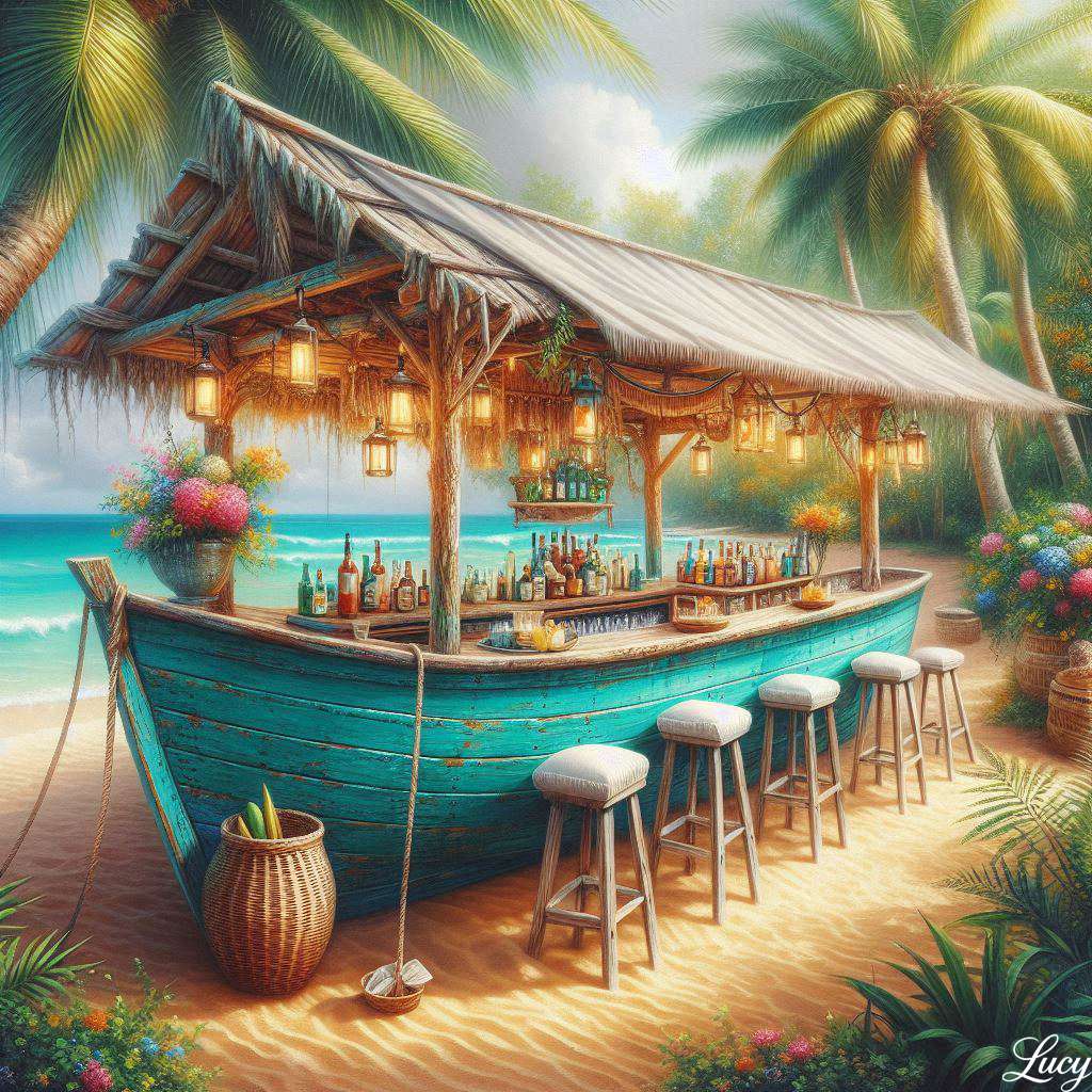 Tropical beach bar crafted from a turquoise boat online puzzle